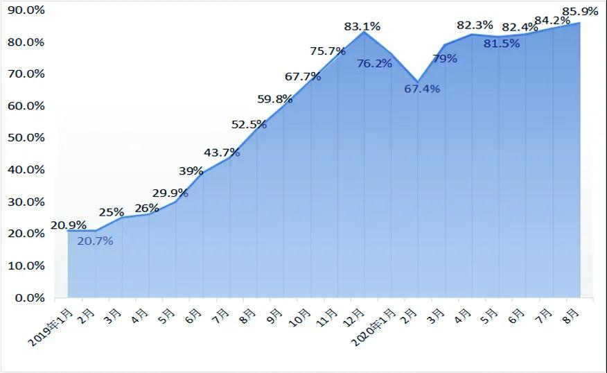 认罪认罚从宽制度适用率图(2019年1月至2020年8月)